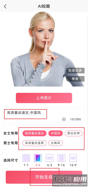 2、进入之后首上传图片,选择喜欢的风格或者自己输入,选择需要的尺寸。