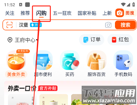 1、打开淘宝app,首页顶部导航栏找到闪购入口;