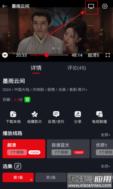 2、在播放页面点击右上角投屏按钮,系统将自动搜索可用设备;