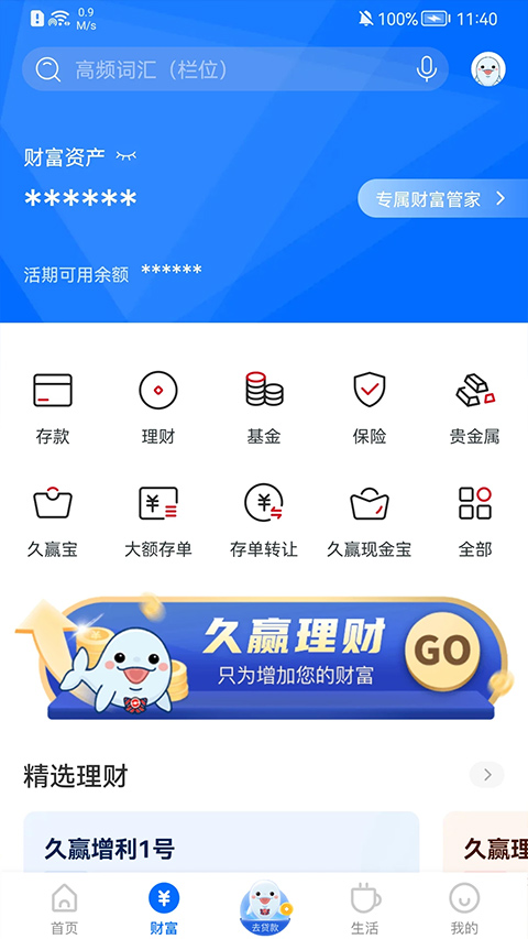 财富管理:提供定期存款、理财产品、基金投资、保险购买及贵金属预约等服务;