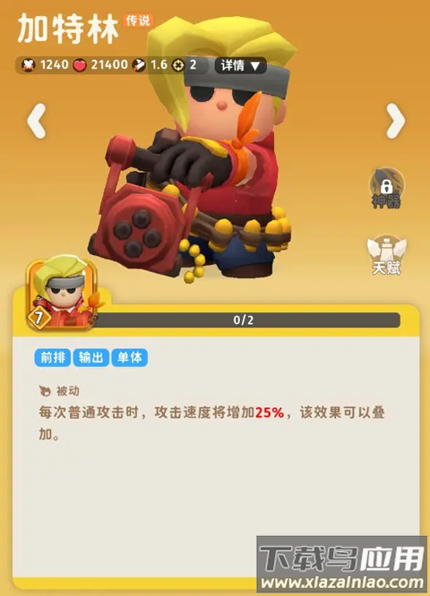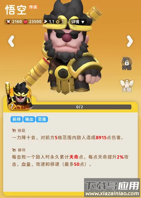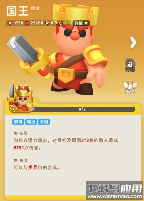 新手期核心传说卡,能提升全场友军攻击力。建议放置在阵容中央,搭配人海战术单位效果显著;