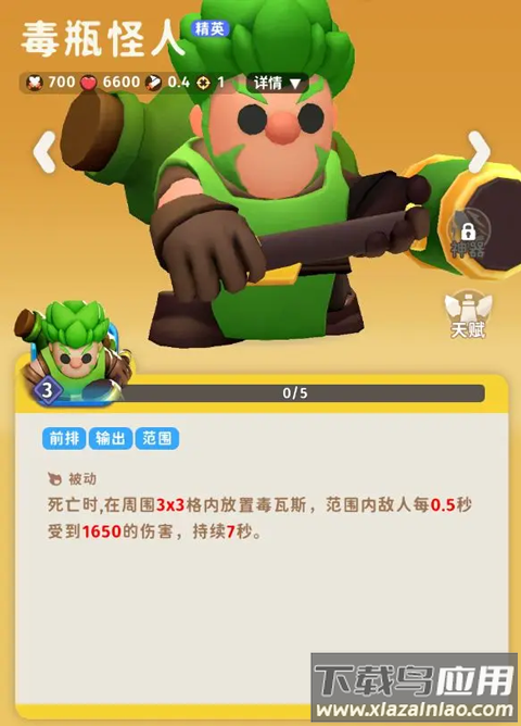 阵亡后产生持续毒雾区域。可放置在前排消耗近战敌人,与冰霜法师配合能形成毒冰双重控制领域;