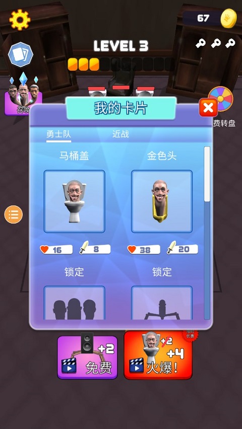 选择马桶人或监控人阵营开启冒险,双方角色具有鲜明特点:马桶人血厚防高适合前排抗伤,监控人则侧重输出。战斗中三个相同角色可合成高级单位,最高能升到三星。点击左上角卡片图标可查看所有角色的详细属性,包括攻击范围、特殊技能等关键数据。