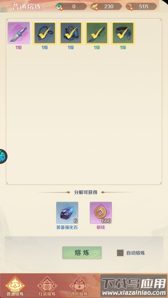3、低阶装备可通过熔炼系统转化为强化石与铜钱;
