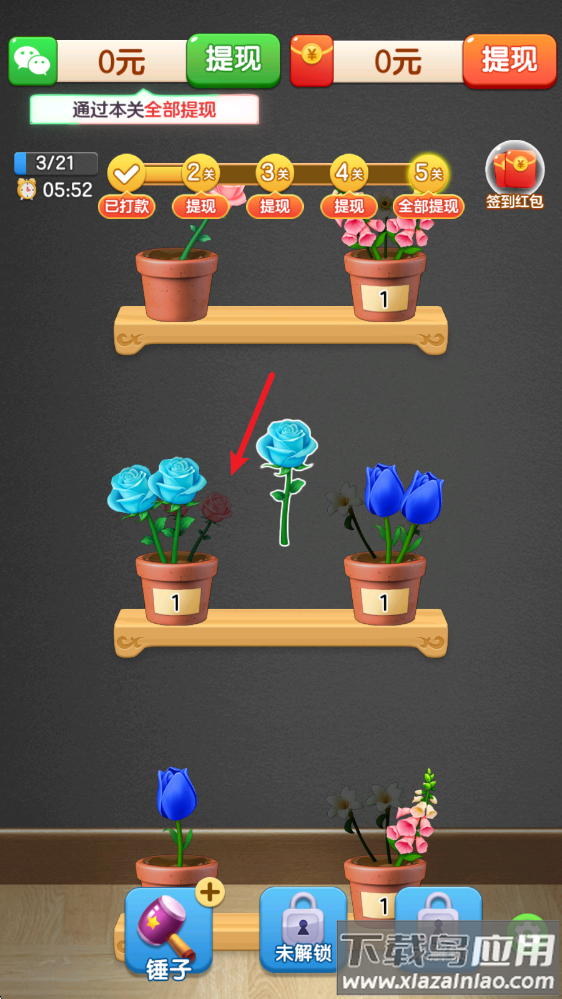 1、点击选中花朵后,再点击目标花瓶即可完成移动操作,注意每个花瓶最多容纳5朵花;