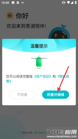 1、打开应用,在提示窗口点击同意并继续;