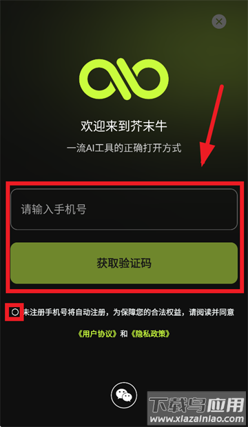 跳转至登录界面后,输入手机号,勾选未注册手机号将自动注册,为保障您的合法权益,请阅读并同意用户协议和隐私政策,点击获取验证码即可登录注册