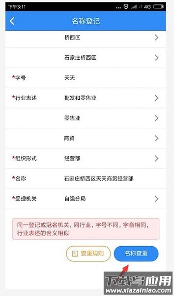 3. 填写包含字号或无字号的名称信息,系统自动进行名称查重检测;