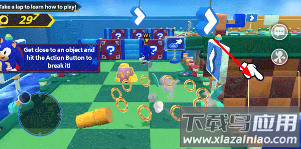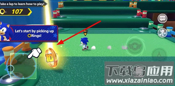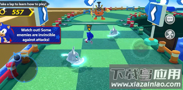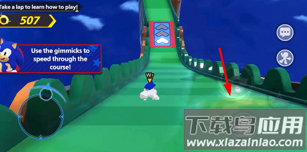 2、左侧虚拟摇杆控制移动方向,注意躲避场景中的旋转齿轮和弹跳机关;