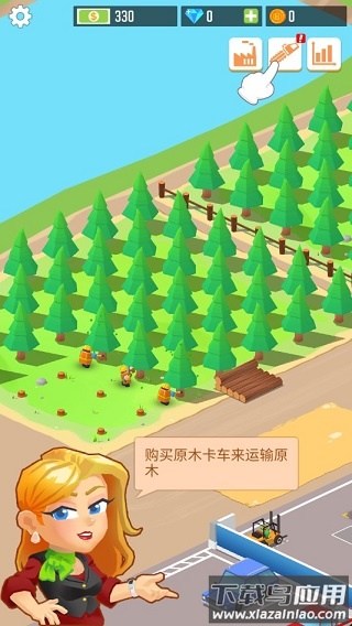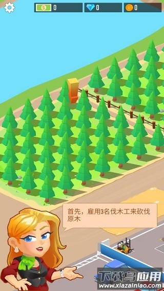 1、游戏初期会由秘书丽莎引导熟悉基本操作。第一步需要雇佣3名伐木工开始木材采集,点击原木区域即可进入工人雇佣界面。