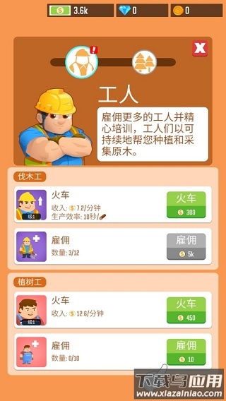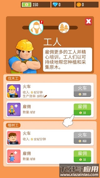 2、不同类型的工人负责不同工作,伐木工负责砍伐,植树工负责补种。合理配置员工比例才能保证木材供应稳定,建议先雇佣一名伐木工开展业务。