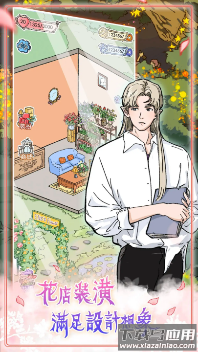 在漂浮的空中岛屿上开辟专属花园,种植各类花卉完成订单任务,赚取金币解锁新区域;通过日常互动与三位男主培养好感度,触发专属剧情和隐藏故事;自由装饰花店内部空间,搭配不同风格的家具摆件;探索人界小镇、神界学院等特色场景,体验清新唯美的视觉享受。