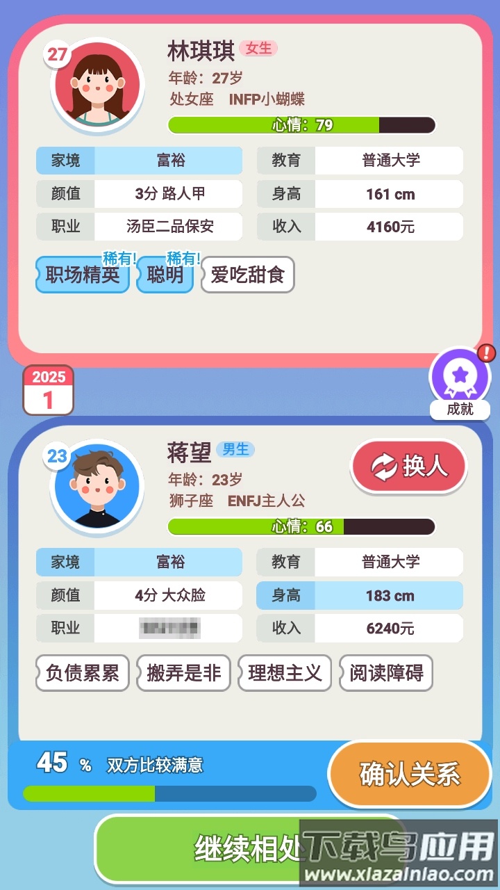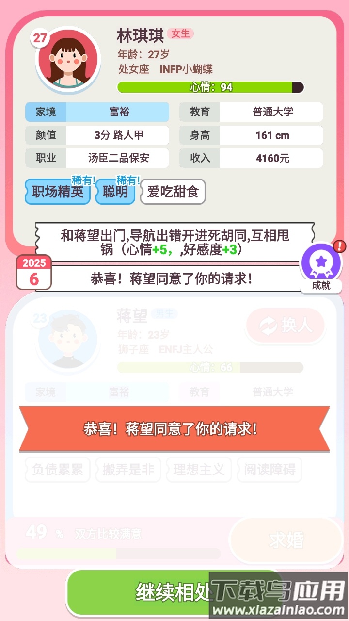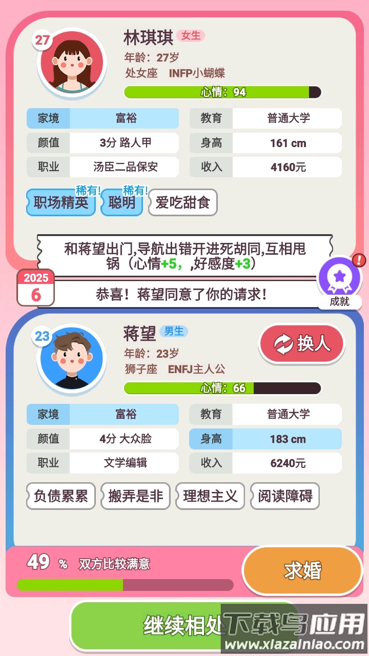 这款游戏用轻松幽默的方式还原了真实的情感历程。角色塑造鲜明生动,剧情发展自然流畅。互动机制设计巧妙,让玩家能深度参与每个重要人生时刻。无论是初次相亲的紧张忐忑,还是婚后生活的柴米油盐,都刻画得入木三分。整体体验既有趣味性又不失深度,值得推荐给喜欢模拟经营类游戏的玩家。