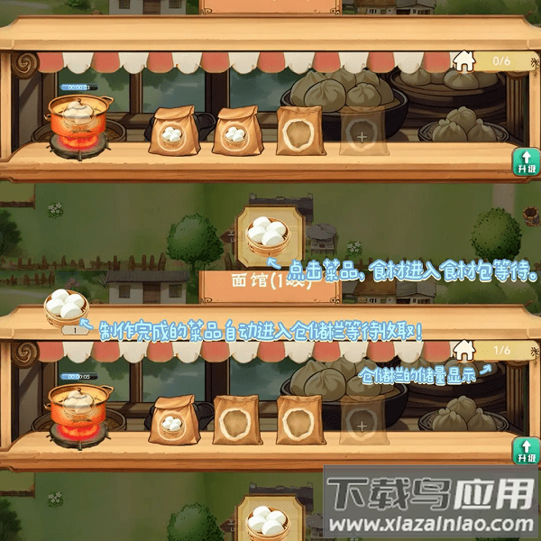 点击菜品,食材进入食材包开始烹饪;前一道菜出锅,下一道自动接档,食材跳进锅里开始咕嘟咕嘟的魔法时间;做好的菜会自动存入仓储栏,仓储栏满时会停止烹饪。