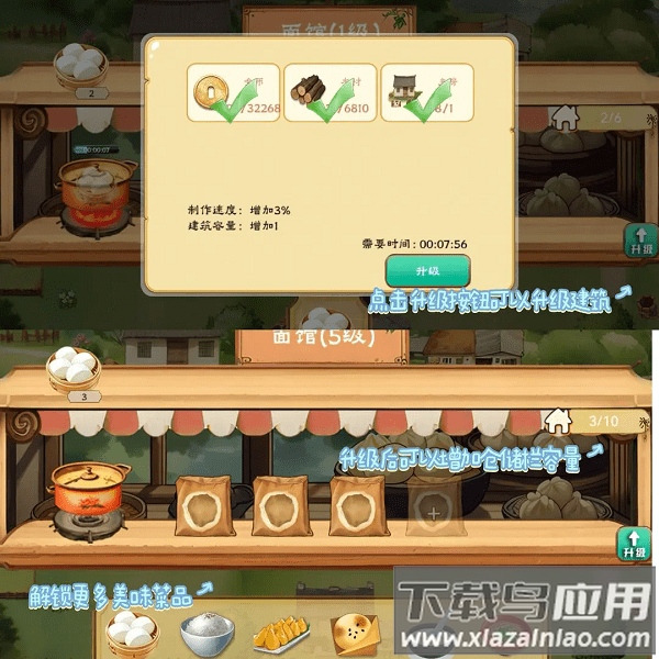 升级厨房能解锁更多菜品,提升烹饪速度,扩大仓储容量;点击窗口右下角升级按钮,需要攒够金币和木材。