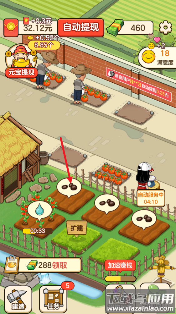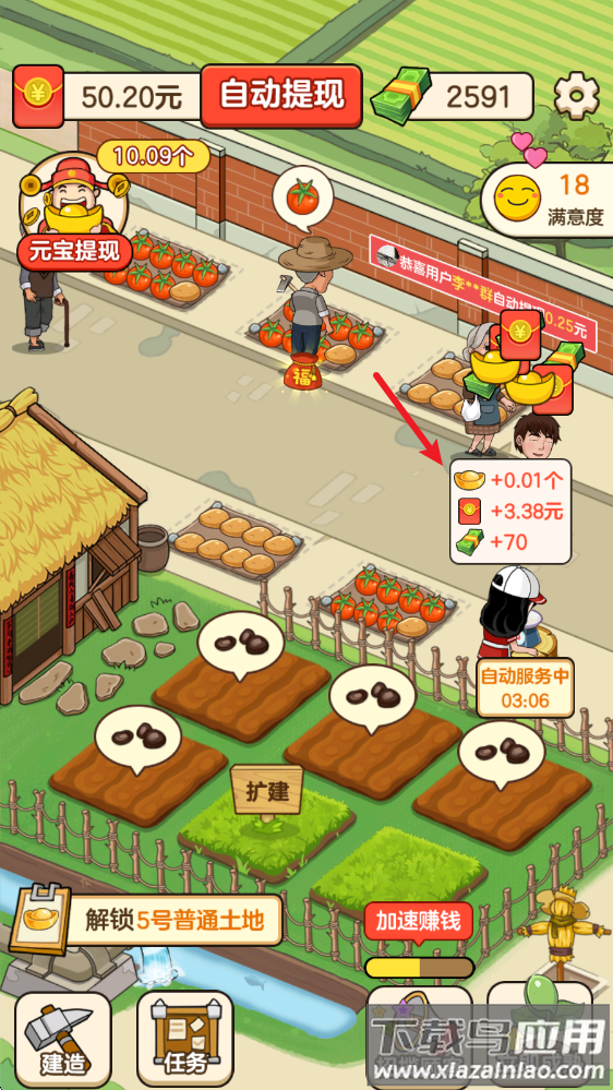 3、作物成熟时会闪烁提示,点击收获自动补货到摊位,不同作物生长周期从30秒到5分钟不等。