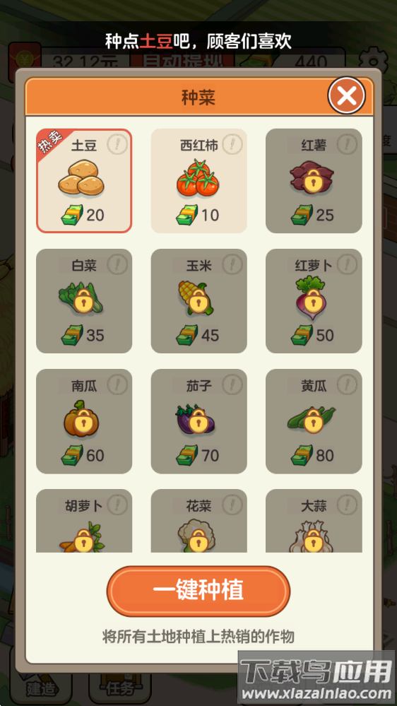 2、打开种植列表后,可以自由选择作物,优先种植标有热销图标的品种收益更高。