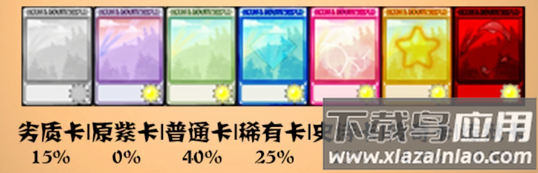 3、通关后进入抽卡环节,卡牌分为七个等级:劣质卡15%、普通卡40%、稀有卡25%、史诗卡15%、传奇卡4.5%、炼狱卡0.5%;