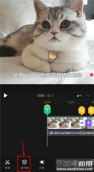 1、首先打开个要编辑的视频,然后点击下方的画中画功能,选择一张图片作为背景。
