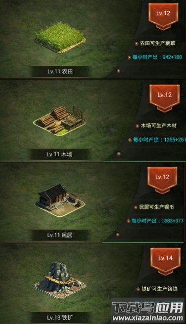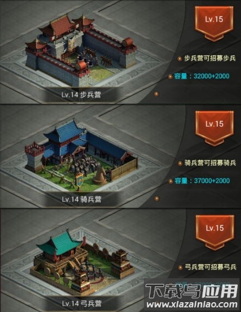 游戏内12类建筑需依序发展,推荐升级顺序为:官府→太学院→仓库→城墙→步兵营/骑兵营/弓兵营→铁矿/农田→民居→木场→商店。