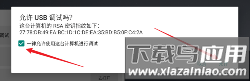2、进行ADB权限授权,点击授权按钮,弹出USB调试提示框;勾选“一律允许”,再点击“允许”;