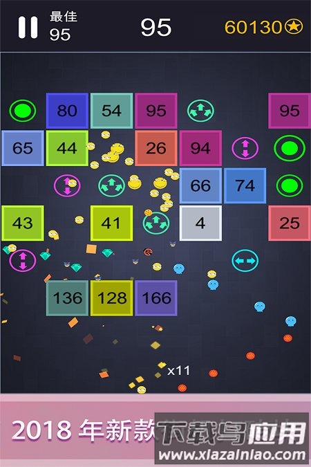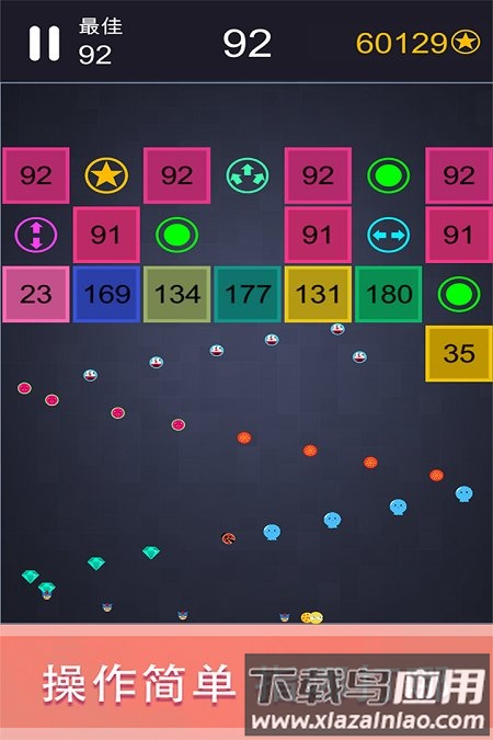 玩家通过触摸屏幕下方并滑动手指来控制弹球方向,砖块上显示的数字代表击碎后可获得的分数,目标是在所有砖块抵达顶端之前将它们全部清除。