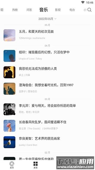 2、点击底部“音乐”标签,进入音频板块。这里收集了音乐人的作品与故事,可收听并关注喜爱的声音;