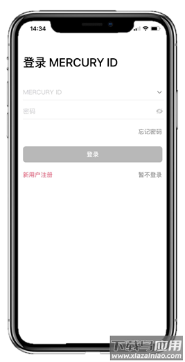 1. 在APP中登录MERCURY ID:打开应用后,输入账号与密码点击登录;如无账号,可点击“新用户注册”按指引完成注册;