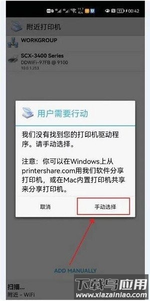 若未找到对应打印机驱动程序,可点击“手动选择”进行查找;