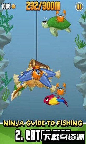 2、海底藏有宝箱,收集宝箱和鱼类均可获得奖励;将鱼钓起后,在空中划屏切开鱼类获取金币,注意避开炸弹,否则会损失所有收获。