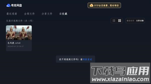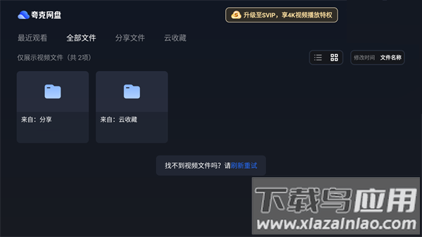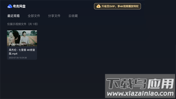 2、主界面默认展示全部文件夹,仅视频文件可见,其他类型文件会被自动过滤;顶部为夸克网盘标识,下方导航栏依次为最近观看、全部文件、分享文件与云收藏入口;