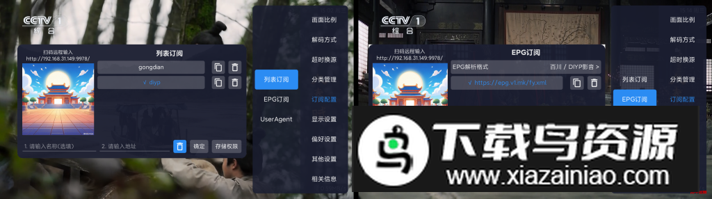 安装后首次打开是空壳,需要手动配置直播源;按下遥控器菜单键进入设置,找到订阅配置,点击列表订阅后输入直播源地址;输入后务必点击选中才能生效。