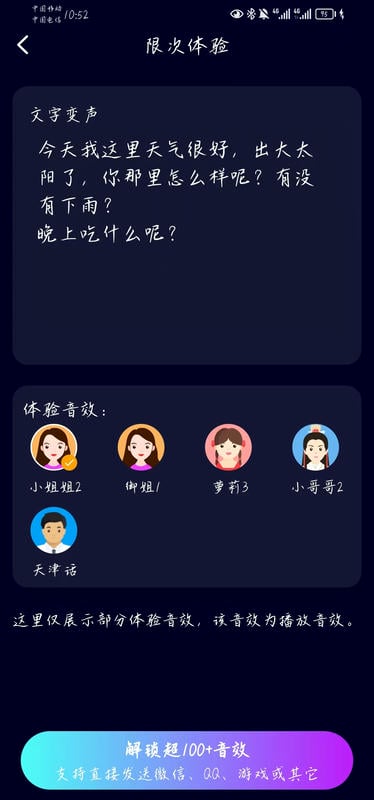通过在文字变声页面输入文本内容,系统自动转换为语音,试听满意后支持保存或直接发送至聊天软件。