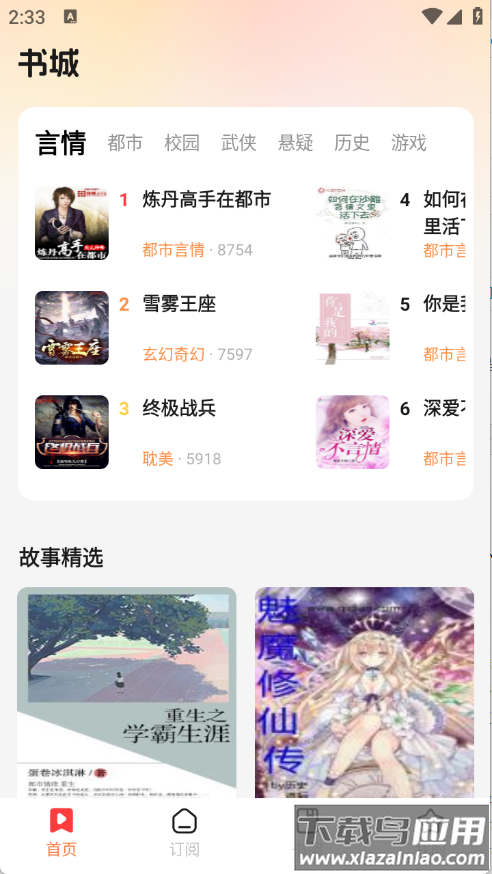 2、首页提供多种小说分类,包括言情、悬疑、历史等常见题材。