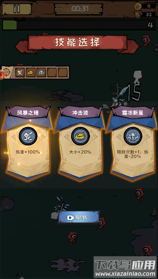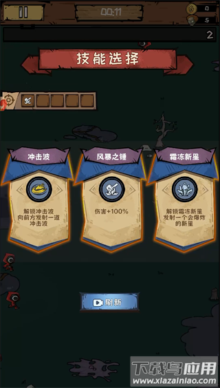 4、消灭足够数量敌人后即可升级,每次升级会随机出现三个技能加成供选择;