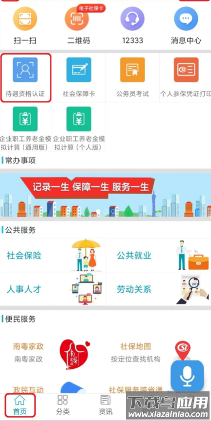 1、进入“广东人社”App,登录在首页选择“待遇资格认证”