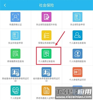 第三步:在【社会保险】页面中,找到并点击【个人缴费记录查询】即可,如下图所示。