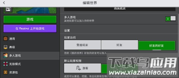 2)进入地图设置开启多人游戏,将权限设为好友的好友即可开放房间。