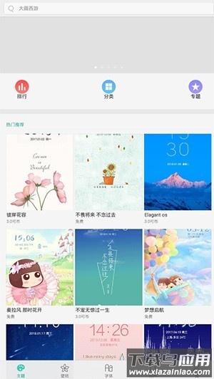 3、主题页面提供精品推荐,包括手绘插画、简约风、卡通漫画和文艺清新等多种风格;