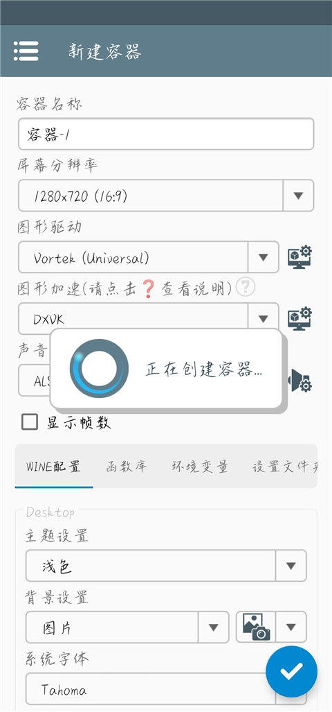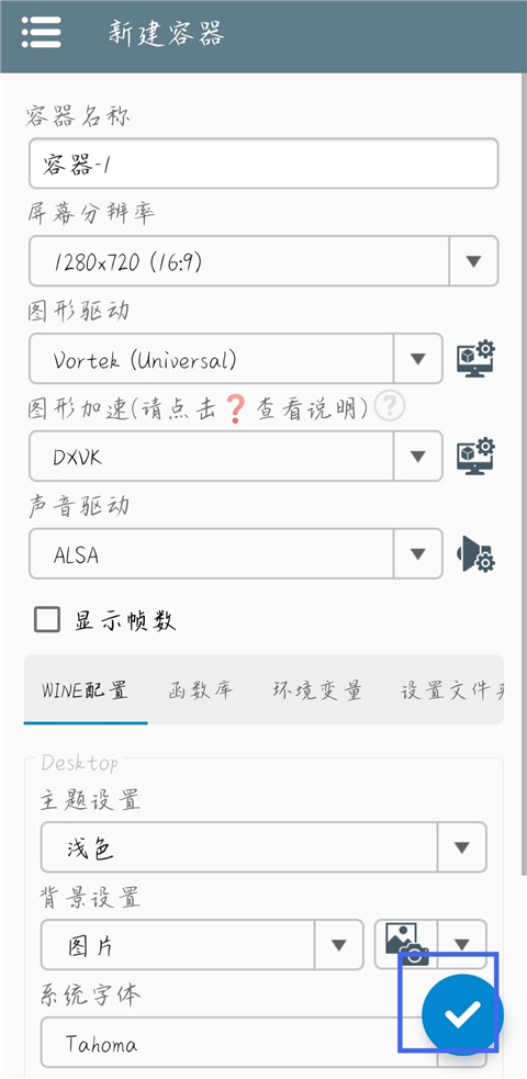 2、进入创建容器页面后,点击右下角的对勾确认。