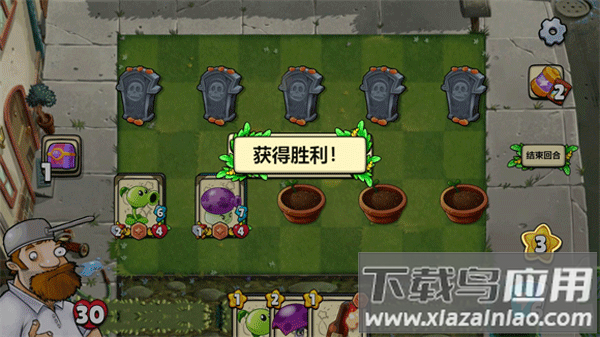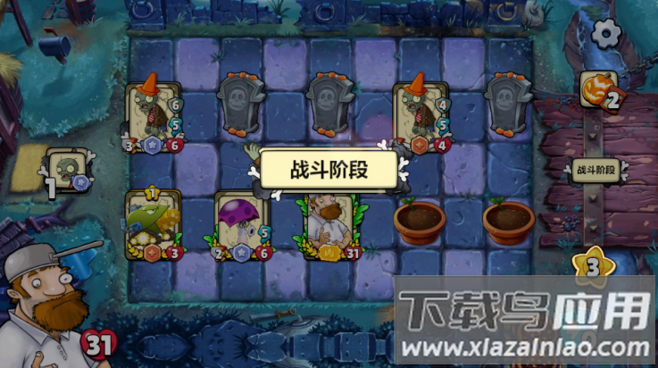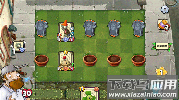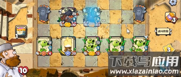 4、将植物卡牌拖放到花盆上进行种植,每张卡牌都标注有血量和攻击力数值,需要根据战场情况合理布局;