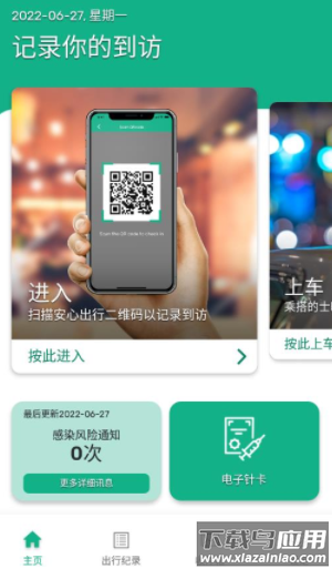 3、离开场所或车辆时,点击“离开”选项,相关出行记录将加密保存在用户手机中。