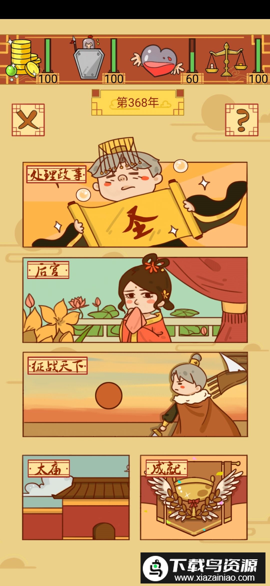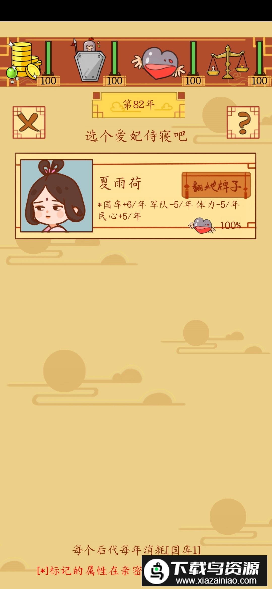 初次接触这款游戏时,建议先开几局熟悉基本操作,了解政事选项中每一项带来的影响;在随意尝试的过程中,你可能会发现某些属性数值下降很快,难以控制。这时有人会选择纳妃生子,但要注意每个妃子和子女都会消耗国库资源,而且选妃环节中几乎找不到属性总和为正的妃子,每个都是亏本的。