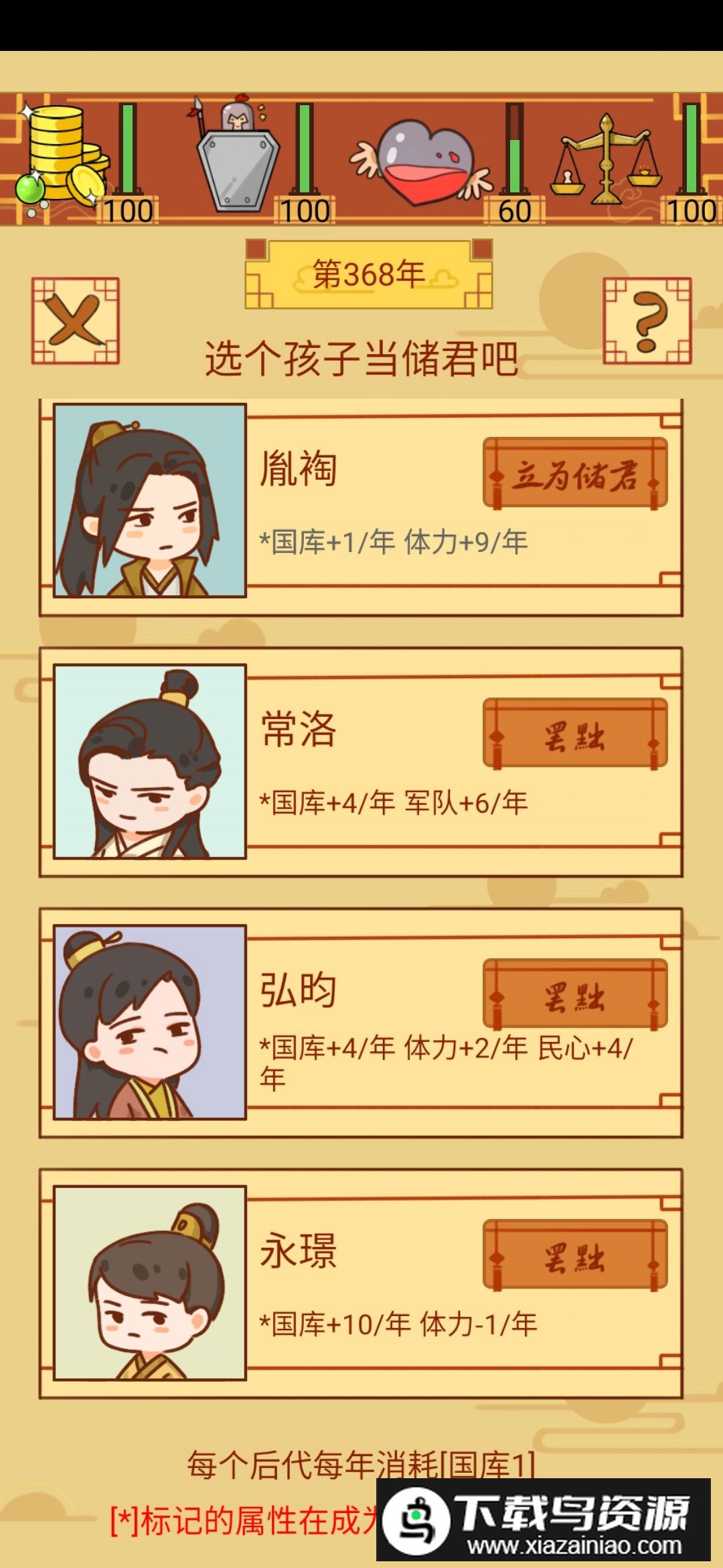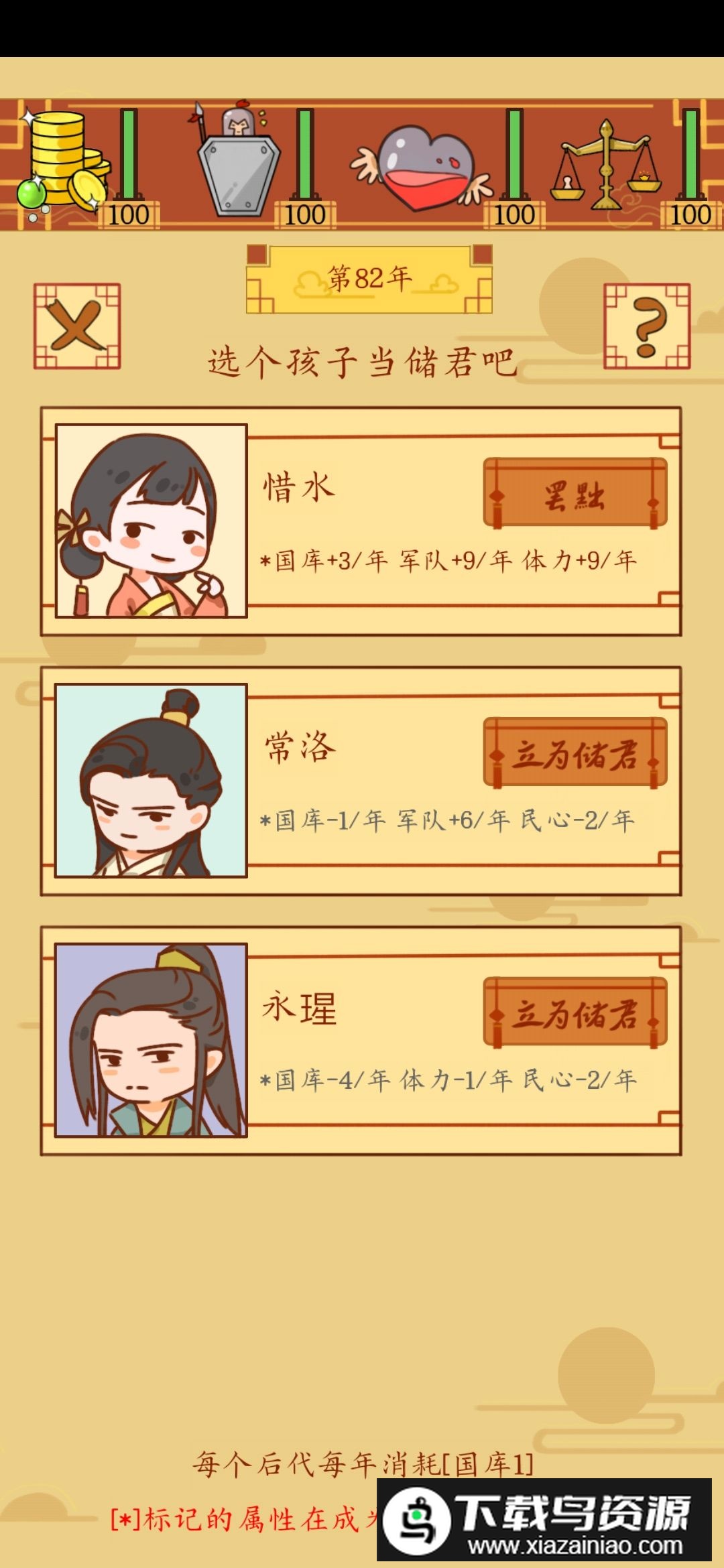 2.及时查看子女属性,对数值有帮助的可以立为储君,如果遇到战力在17至25之间的孩子,可以攒一两个在同一回合内攻打一块地盘,能快速开拓疆域;