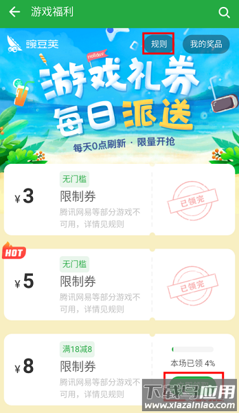 每日0点平台会限量发放免费礼券,用户点击“立即领取”即可获取,先到先得;