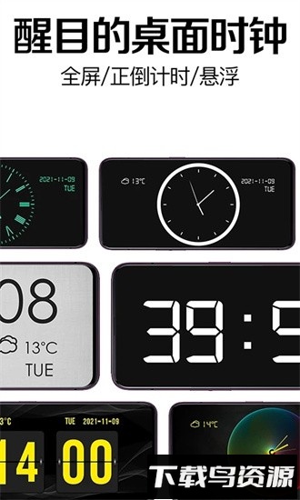 个性多变的时钟皮肤:提供科技、星空、自然、艺术、复古、暗黑等多种风格皮肤,涵盖数字与模拟表盘,满足不同审美需求。