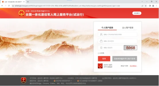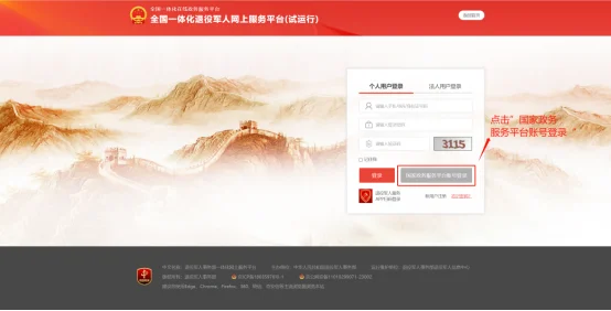 2、点击页面右上角“登录”按钮,输入国家政务服务平台账号密码及验证码完成登录。忘记密码可点击登录页“忘记密码”找回;忘记账号需联系安置地退役军人事务部门。