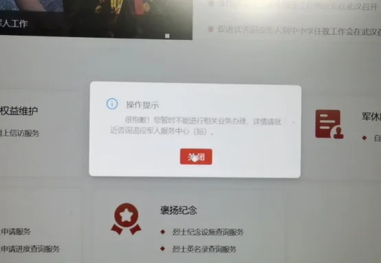 4、若无法正常跳转并显示错误页面,请检查注册账号时使用的身份证与姓名是否与退役金系统信息一致,不一致需联系安置地退役军人事务部门。