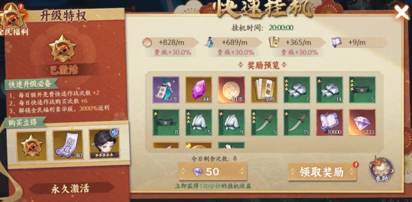 每日消耗钻石领取挂机资源,加速角色成长进程。