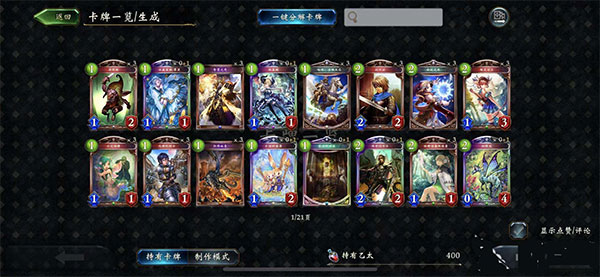 卡牌界面支持牌组编辑与卡牌制作。每组牌组包含40张卡牌,可按指定系列或无限制规则构建。卡牌制作功能允许玩家消耗资源合成特定卡牌。